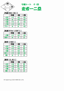 それを緩和しようとして考えついたのが、「守備シート」です。「守備表」を分解して、「走者一二塁」とかのシチュエーションごとシートを作るというものです。表の枚数は多くなるのですが、一見してみやすくなるとおもいます。